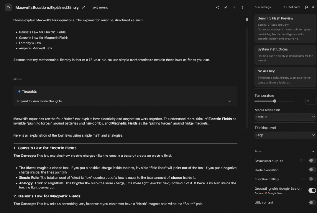 Here we have a prompt requesting Gemini to explain Maxwell’s four equations, which govern classical electrodynamics. The first law is the simplest, with an approximately accurate analogy to explain it. But by the time we come to the last two laws, which are more complex as they involve the interactions between electric and magnetic fields, we get analogies as such: