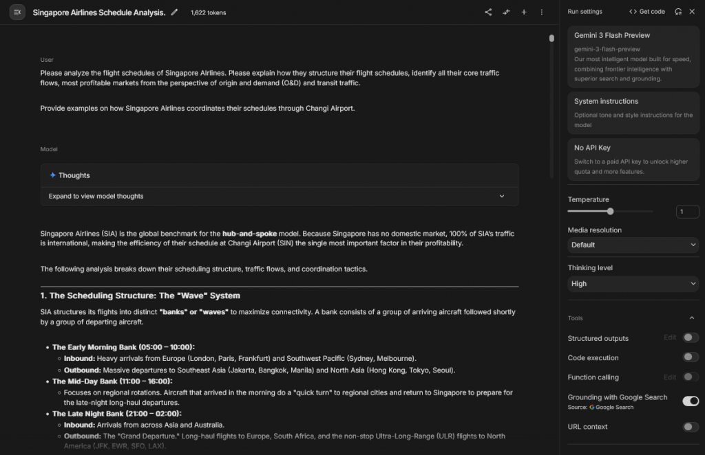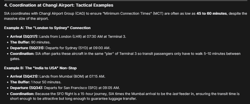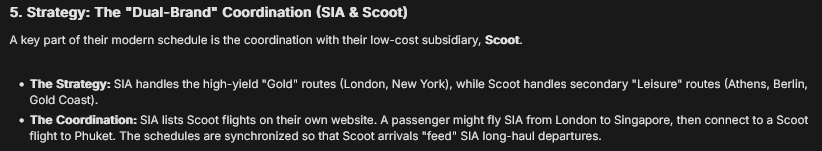 Here, we try to get Gemini 3 Flash to explain the “hub and spoke” model of SQ and how they structure connection banks for flights through Singapore.